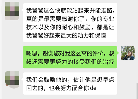 来自患者家属和康复治疗师的聊天截图