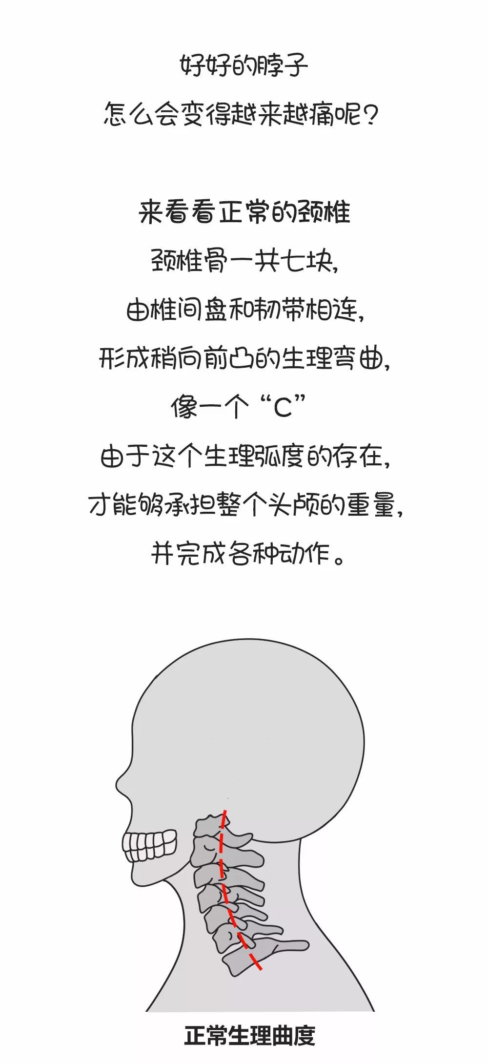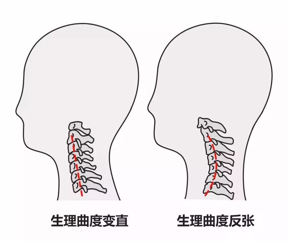 但是,这种生理曲度并不是一成不变的,如果我们天天长时间、高强度地使用我们的颈椎,而且还不注意保护和保养的话,慢慢地它就变“直”了,弧度也就随之消失了,变成这样。