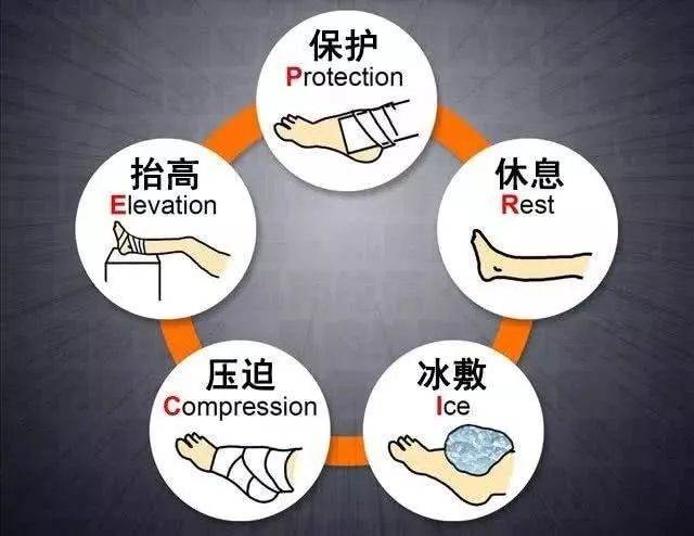 我们通常可以按RICE原则处理:即休息(Rest)、冷敷(Ice)、加压包扎(Compression)、抬高患肢(Elevation)。